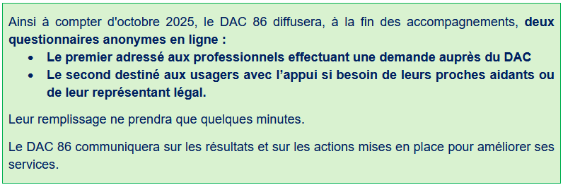 Déjà, fin 2024, l’Agence régionale de santé et les 12 DAC de Nouvelle-Aquitaine, accompagnés par leur fédération régionale - la FéDAC – se sont mobilisés pour tester le questionnaire de satisfaction du service rendu auprès des professionnels. Plus de 1 000 professionnels ont répondu (22 % de taux de participation) et nous ont conforté dans nos missions.